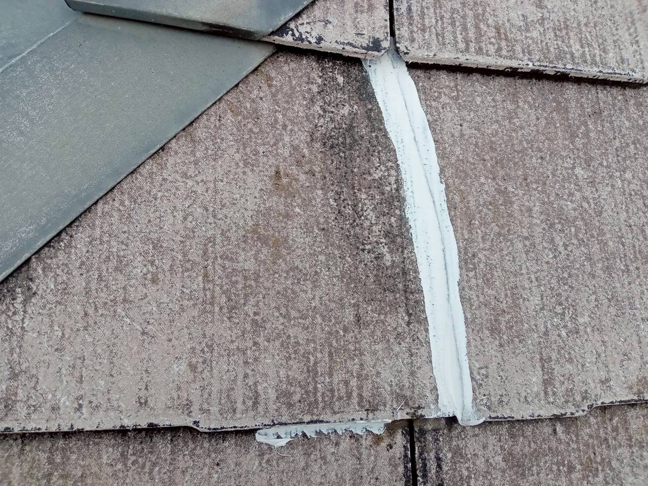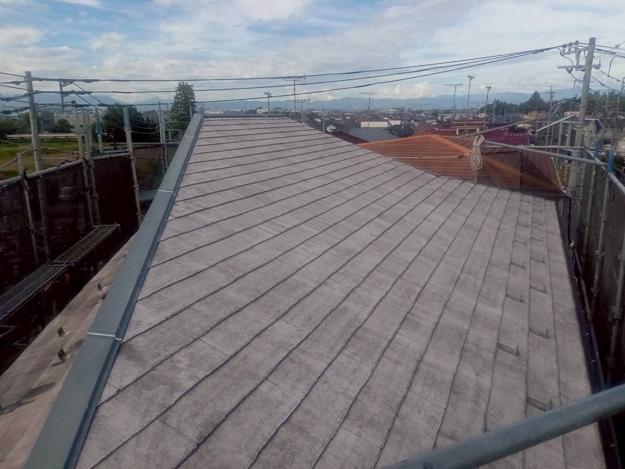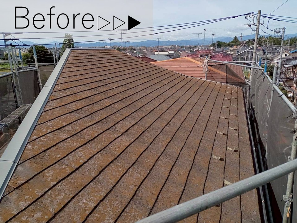 屋根材の塗膜が劣化し、防水性が失われ、色あせや軽度のひび割れも見受けられました。塗膜が失われると、将来的に割れや反れ、雨漏りの原因となります。