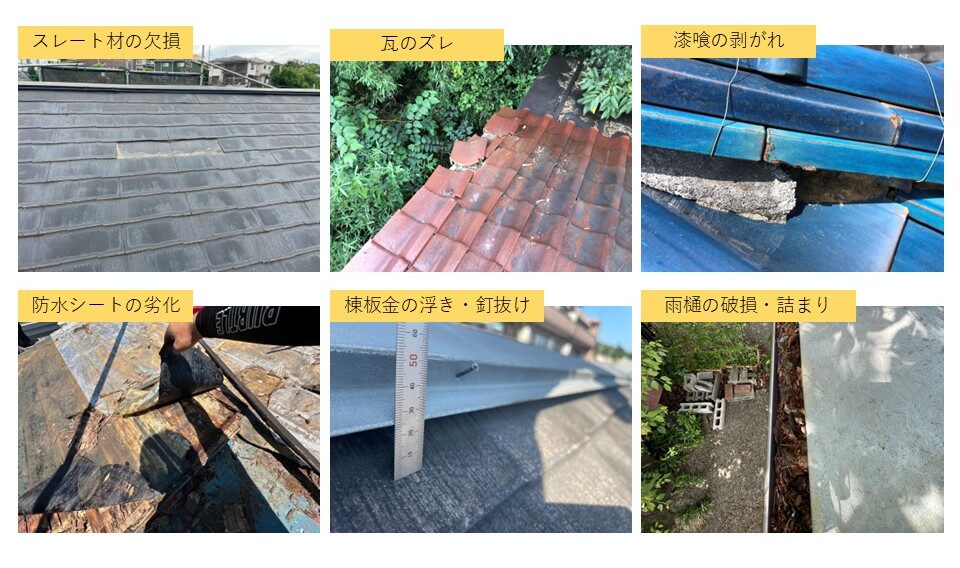 - 瓦など、屋根材のズレや割れ・欠損