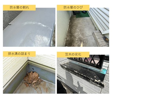 屋根外壁と同じく雨風に晒される箇所であり、人の出入りも頻繁にある分、摩擦で防水層も劣化しやすくなります。また、構造上水が溜まりやすいため、排水口が詰まって排水処理が上手くできないと防水層との接合部などから内部へ浸水してしまいます。